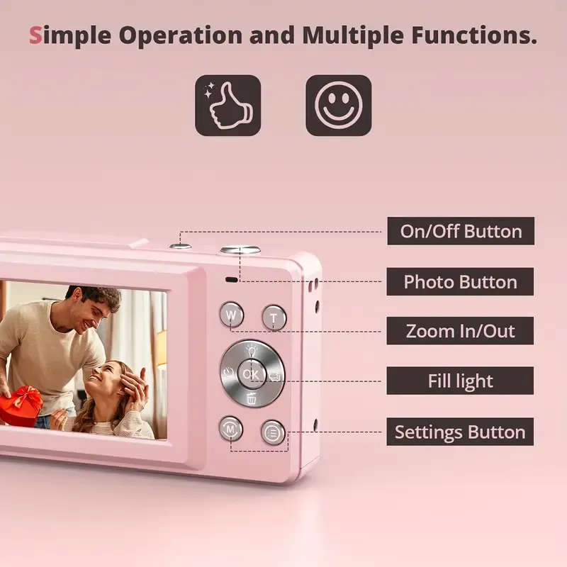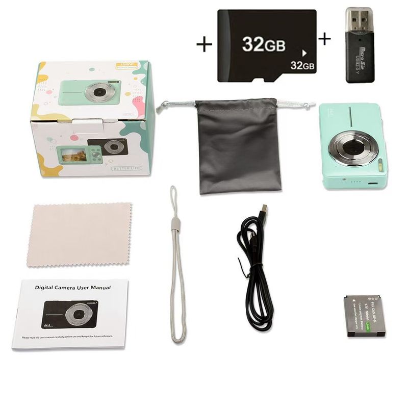 Rechargeable Digital Camera, 16x Zoom, 1080P 44MP Camera - Compact Size, OLED Display, USB Charging, Suitable for Photography Beginners, Live View, AmateursThis digital camera, designed for students, features a built-in LED fill light, video recording, and facial recognition. It uses a 5-megapixel CMOS image sensor, achieving a single-shot resolution of up to 44 megapixels. Video resolution is 1920x1080 Full HD (FHD), and the lens boasts a 66° wide-angle angle. It features a 2.4-inch 320x240 IPS LCD screen. Photos are saved in JPG format, and videos are recorded in AVI format. The camera is equipped with an Ff (f/3.2, f=7.36mm) lens. The Selfie can be set to single, 2 seconds, 5 seconds, or 10 seconds. Battery life is up to 90 minutes (video recording) and 150 minutes (photo recording).